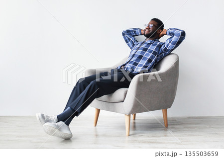 Peaceful young black man relaxing in armchair against white studio wall, free space. Full length of African American guy enjoying lazy weekend morning, resting with hands behind head