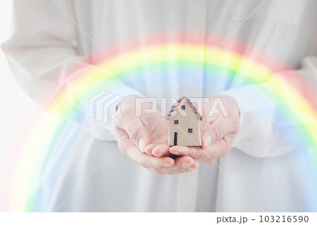 woman hands holding home model with rainbow