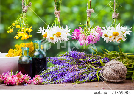 Drying and harvesting of medicinal herbs, homeopathy and alternative medicine concept