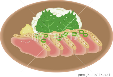馬刺しのイラストです。おろしにんにくと生姜、しそと大根が添えられています。土用の丑の日の定番食です。