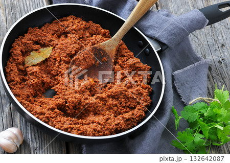 cooked minced meat with vegetables onion carrots in a frying pan top view. copyspace.