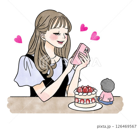 カフェで推しぬいの写真を撮る女の子のイラスト