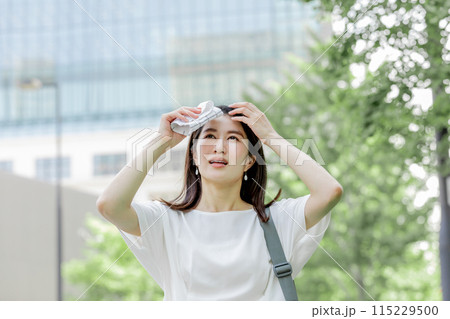 額の汗をハンカチで拭き陽射しを気にする女性