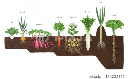畑に植わっている様々な根菜類のイラスト