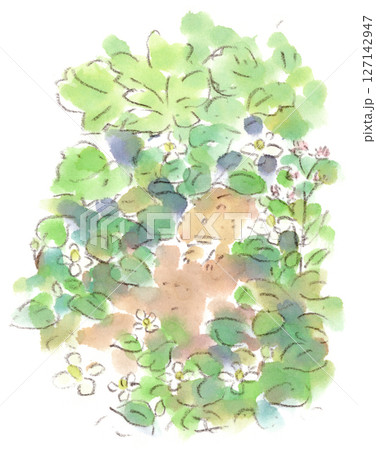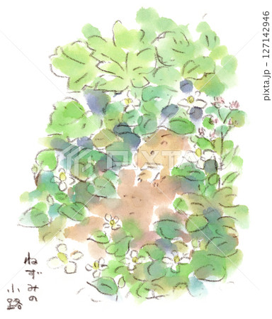 ねずみの巣「ドクダミやハルジオンが咲く草むらとけもの道とねずみ」の水彩画イラスト