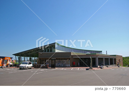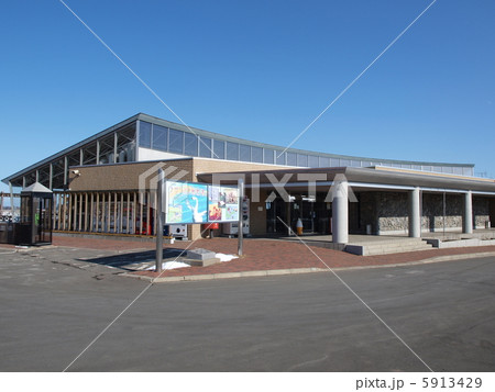 【根室市 風蓮湖展望デッキから望む「道の駅スワン44ねむろ」のガラス張り駅舎と風蓮湖】