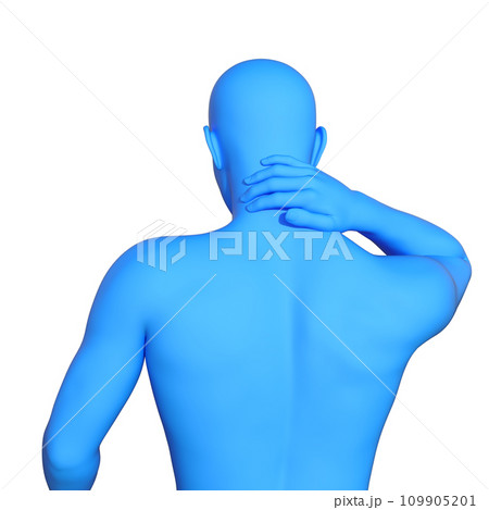 首こりに悩む男性 青いマネキンを後から見た上半身後ろ姿の3Dイラスト