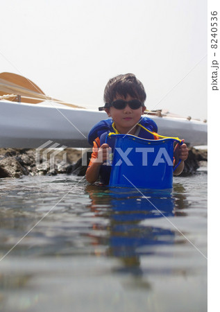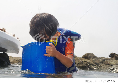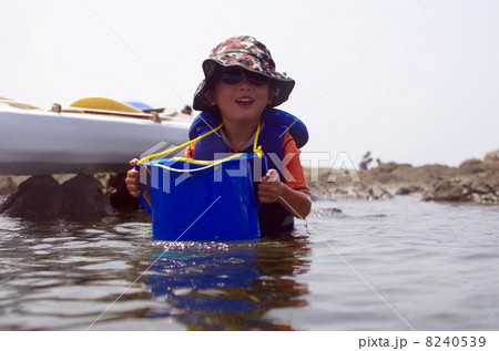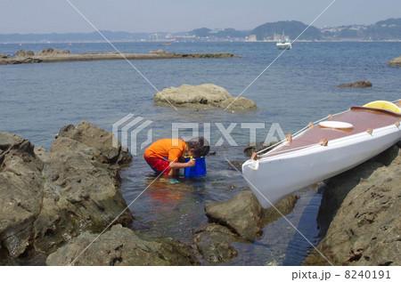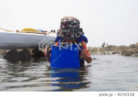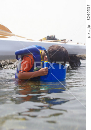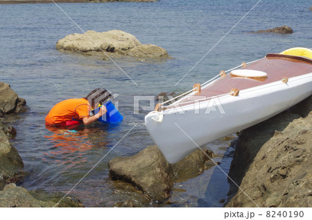のぞきメガネで水中観察する子供と手作りシーカヤック