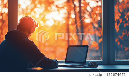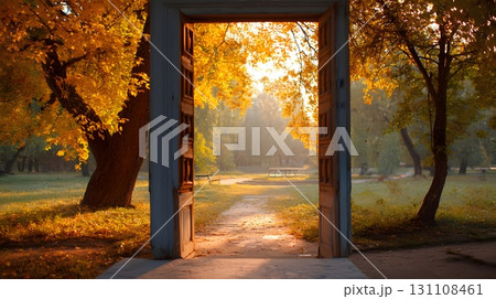 Open wooden doorway framing a sunlit autumn park, golden leaves glowing in morning haze