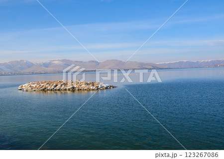 Frozen lake and snowy mountains. Tall grasses on the lake. Bamboo and frozen river. Beautiful winter landscape with lake and mountains. Ice lake