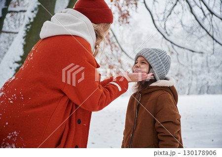 Taking care of girl. Mother and her daughter is on the winter meadow and forest