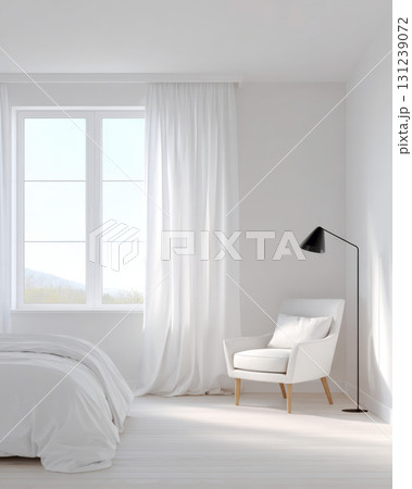Calm minimalist bedroom interior with modern white furniture. peaceful home room has large window with bright natural light, creating serene and relaxing space