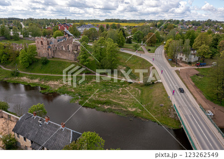 Aerial View of Ruined Castle and Bridge in a Latvian Town Dobele