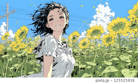 夏の晴天の日、ひまわりの畑を散策している黒髪の若い女性