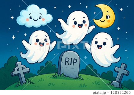 Cartoon ghostly night scene with cheerful ghosts and moonlit sky in a starry cemetery landscape concept of spooky fun halloween illustration, cute nighttime