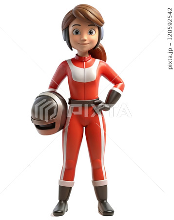 Friendly animated female racer in red suit with helmet ready for adventure