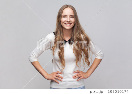 Portrait of happy joyful cheerful beautiful woman with long blond hair standing with hands on hips, looking at camera, expressing happiness. Indoor studio shot isolated on gray background.
