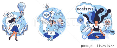 Positive thinking. Three scenes depicting a woman with a light bulb, a man working on a laptop generating ideas, and a person meditating. Ideal for creativity, innovation, productivity, mindfulness