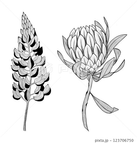 detailed sketch of a lupine flower and exotic protea flower. Hand-drawn. design greeting card and invitation of the wedding, birthday, Valentine's Day, mother's day and other holiday