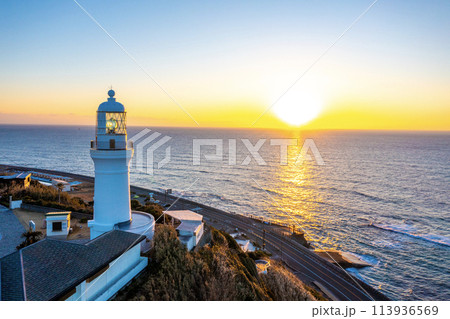 千葉県銚子市君ケ浜の君ヶ浜しおさい公園休憩所から犬吠埼灯台方面