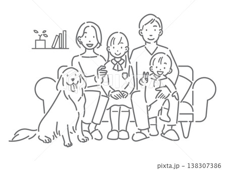 みんなで一緒にソファに座る笑顔の家族とペットの犬 シンプルでお洒落な線画イラスト