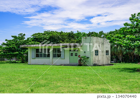 青空の下に佇む緑に囲まれた石垣島の古いコンクリート建物