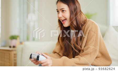 Beautiful young asian woman sitting in living room sofa holding joystick