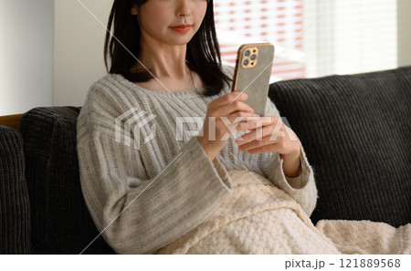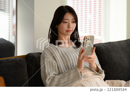Beautiful young asian woman sitting in living room sofa