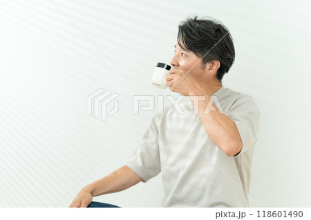 Photo of young brunett with glass of coffee in his hands sitting on sofa