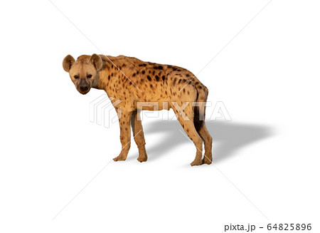 A spotted hyena strides confidently across a white background, showcasing its powerful build and distinctive markings. Wildlife Animals.