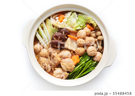 冬の寄せ鍋(お鍋料理、土鍋)。未加熱状態の具材盛合わせイメージです。白菜、鶏モモ肉、椎茸ほか。