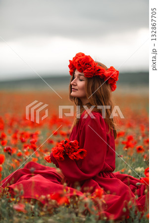 Woman poppy field enjoying quiet moment wearing red flower crown in springtime meadow