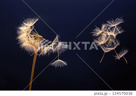 Dandelion seeds drifting in the wind at dusk in a serene garden setting