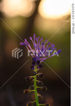 Purple wildflower blooms elegantly against a dreamy sunset backdrop in a serene forest setting