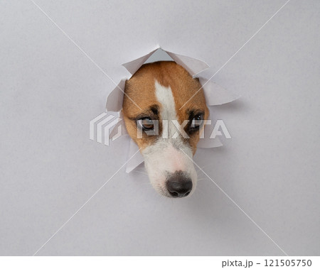 The nose of a Jack Russell Terrier dog sticks out of light gray cardboard. Copy space.