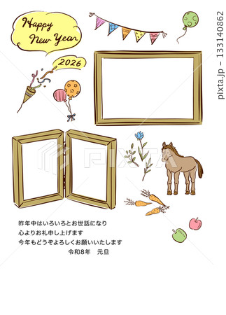 2026年賀状テンプレート フォトフレームとポップでかわいいイラスト