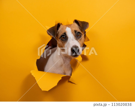 Funny dog jack russell terrier leans out of a hole in a paper orange background.