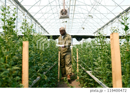 Wide angle shot of adult African American man working as gardener and caring for plants inside industrial glass greenhouse standing between two flowerbeds copy space