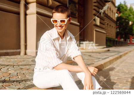 Hipster fashion woman in stylish glasses sits on a curb in the street in Europe.