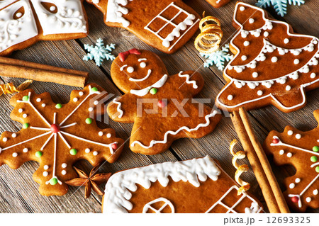 Delicious fresh sweet Christmas gingerbread with festive ornaments