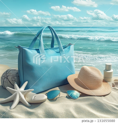 Beach day essentials stylish bag hat sunglasses and starfish by the ocean