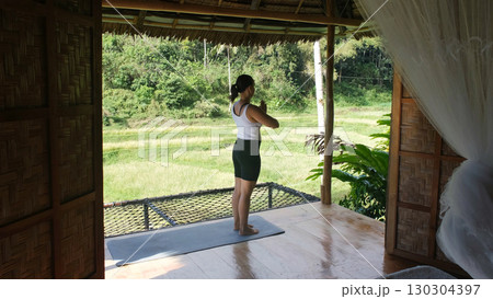 Woman doing yoga on bamboo terrace in early morning light, surrounded by tropical plants and rice fields