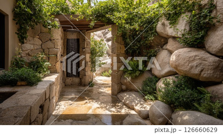Experience a tranquil paradise with this sunlit secret garden featuring a luxurious hot tub