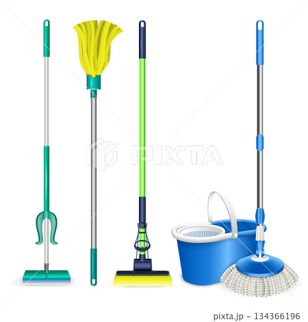 Home clearing. Housekeeping icon. Laundry laying out. Washing rope mop with bucket. Mopping room. Smooth housework. Cobweb vacuum cleaner. Web brush services. Vector cleaning garish pictograms set