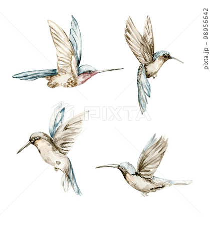 Watercolor set of hand drawn blue hummingbird. Hand-drawn with watercolour on a white isolated background. Perfect for wedding invitation, greetings card, posters, party decor.