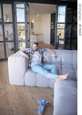 a little beautiful girl in a blue jumpsuit is lying at home on the sofa with her legs raised up.