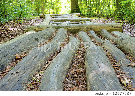 Tactile eco-path made of pine tree cuts in an eco park. Foot massage, prevention of flat feet, reflexology, relaxation, health path, trekking route