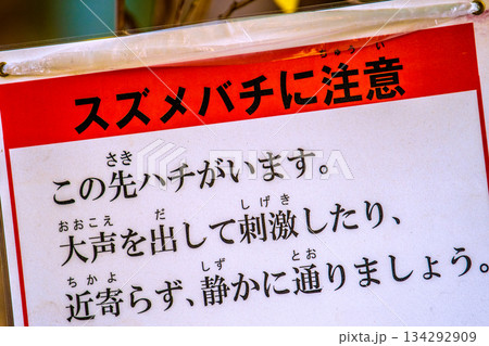 日本の横浜都市景観 スズメバチに注意 ダメ!。「この先ハチがいます。大声を出して刺激したり…。」