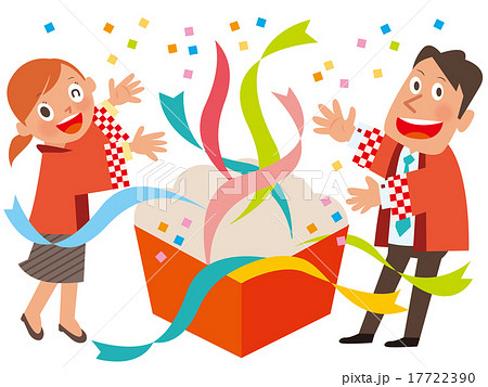 赤いはっぴの男女店員2人と赤い箱_紙吹雪