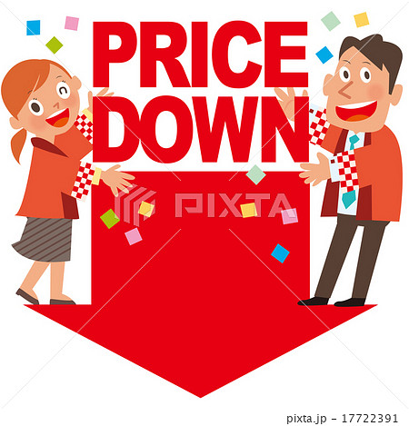 赤いはっぴの男女店員2人と矢印_プライスダウン文字
